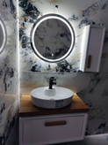 تولیدی ثامن الحجج آماده ارائه سازی انواع آینه باکس و روشویی کابینتی ضدآب می باشد . همانطور که ملاحظه میکنید این فول ست برای فضای بزرگ بسیار مناسب است و از زیبایی و ظرافت فوق العاده برخوردار است .عرض این کابینت40 سانتی متر و طول کابینت 60سانتی متر می باشد و سنگ روشویی از برند گاتریا چینی نام است و به ابعاد عرض 39 سانتی متر و طول 55.5 سانتی متر است این فول ست شامل یک آینه بکلایت و سنسوردار است و ابعاد اینه این فول ست به قطر60 سانتی متر است و باکس کنار اینه عرض 23 سانتی متر و ارتفاع 60 سانتی متر است. توجه بفرمایید که باکس کنار آینه دارای دو طبقه و یک جاحوله ای است . و کابینت به صورت داشبوردی باز میشود و دارای دو لولا و یک جک است.