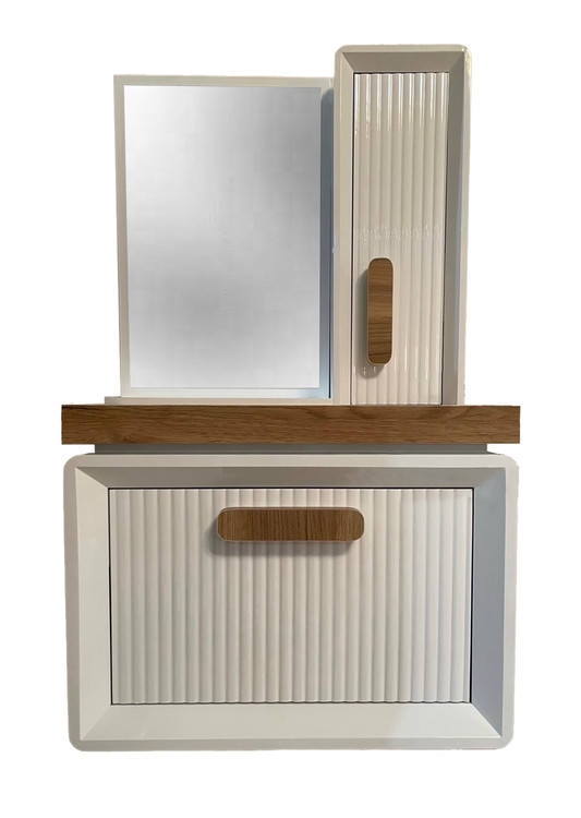 تولیدی ثامن الحجج آماده ارائه سازی انواع آینه باکس و روشویی کابینتی ضدآب می باشد . همانطور که ملاحظه میکنید این کابینت روشویی برای فضای نرمال و متوسط بسیار مناسب است و از زیبایی و ظرافت فوق العاده برخوردار است .عرض این کابینت40 سانتی متر و طول کابینت 60سانتی متر می باشد و سنگ روشویی از برند گاتریا چینی نام مدل مستطیل است و به ابعاد عرض 36 سانتی متر و طول 55.5 سانتی متر است . ابعاد آینه عرض 40 سانتی متر و ارتفاع 60 سانتی متر است و باکس کنار آینه عرض 23 سانتی متر و ارتفاع 60 سانتی متر است.باکس کنار اسنه دارای دو طبقه ویک جا حوله ای است و کابینت به صورت داشبوردی باز میشود و دارای دو لولا و یک جک است.