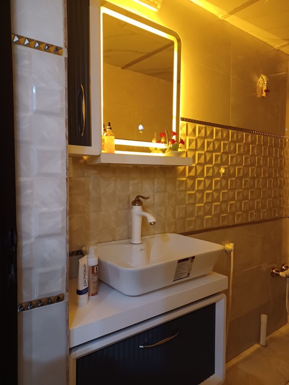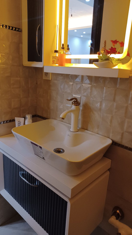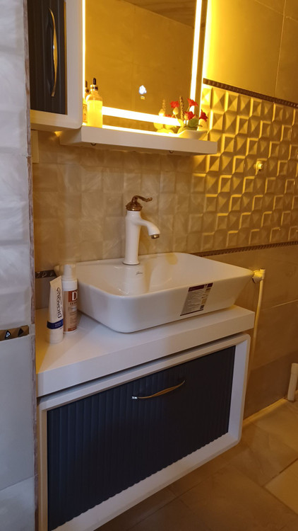 کابینت و روشویی و آینه و باکس کنار اینه و شلف می باشد.