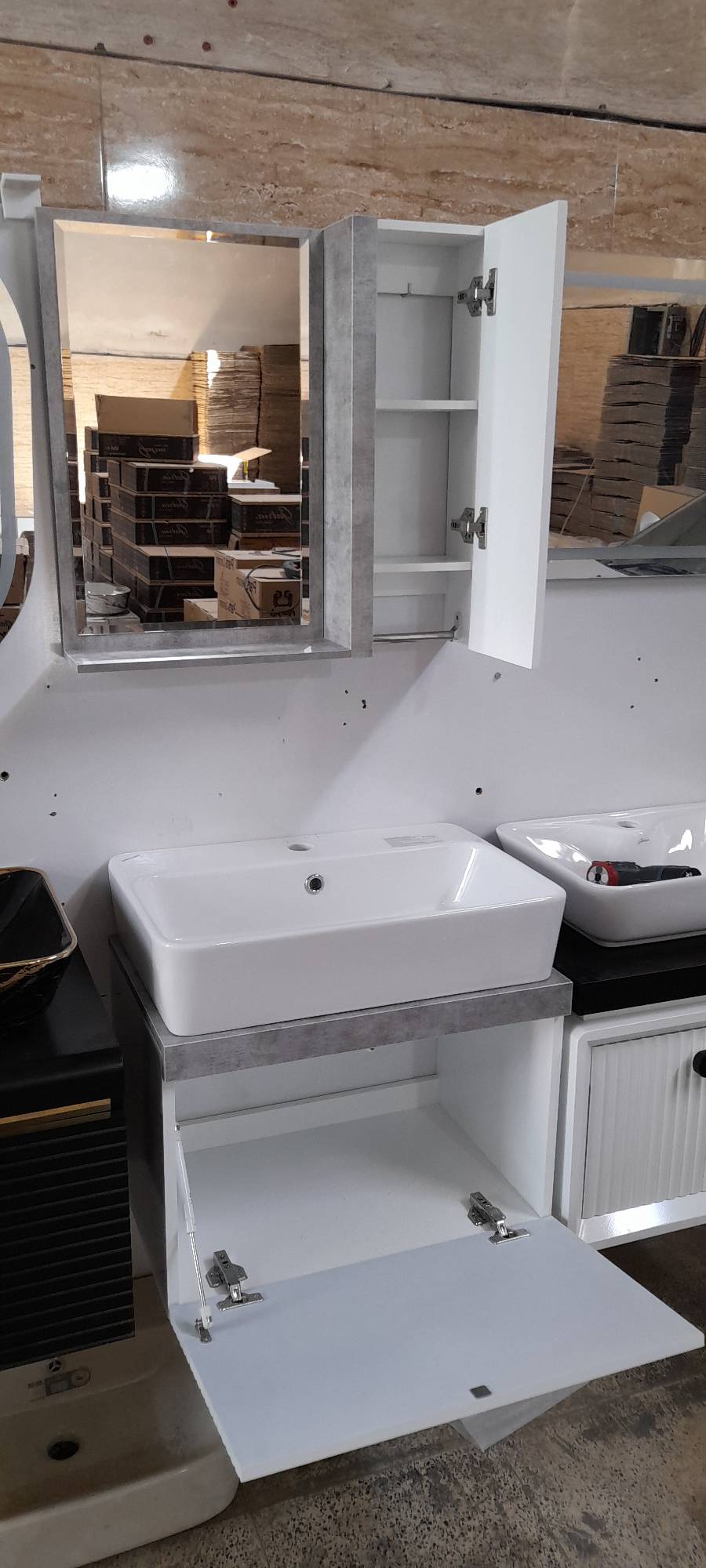 محصولی که مشاهده میکنید ضدآب و ضدرطوبت است و این فول ست شامل یک کابینت به سایز عرض ۴۰ سانتی متر و طول ۶۰ سانتی متر است که درب کابینت به صورت داشبوردی باز میشود و دارای دو لولای استیل و آرام بند و جک است . سنگ از برند چینی کرد عرض ۴۰ طول ۶۰ می باشد.یکی دیگر از اقلام این فول ست شامل باکس کنار آینه به عرض ۲۰ سانتی متر و ارتفاع ۶۰ سانتی متر است . که باکس شامل دو طبقه و یک جا حوله ای می باشد. آینه قابدار و دارای شلف است به عرض ۴۰ سانتی متر و ارتفاع ۶۰ سانتی متر .
