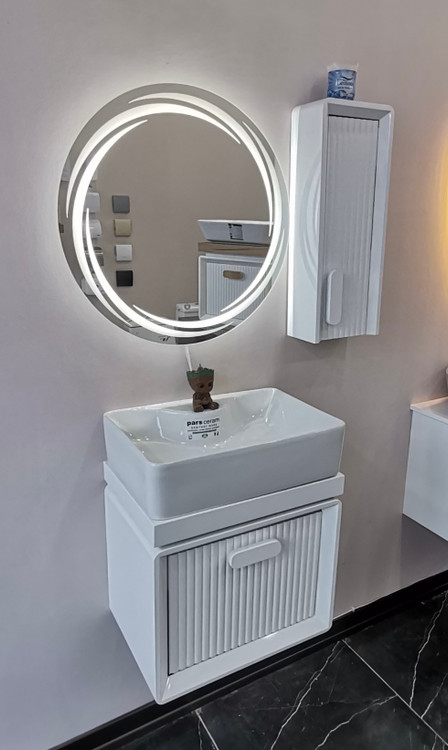 تولیدی ثامن الحجج آماده ارائه سازی انواع آینه باکس و روشویی کابینتی ضدآب می باشد . همانطور که ملاحظه میکنید این فول ست برای فضای نرمال و متوسط بسیار مناسب است و از زیبایی و ظرافت فوق العاده برخوردار است .عرض این کابینت35 سانتی متر و طول کابینت 50سانتی متر می باشد و سنگ روشویی از برندپارس سرام است و به ابعاد عرض 35سانتی متر و طول 50 سانتی متر است .این فول ست دارای یک آینه بکلایت و دارای سنسور حرکتی می باشد ابعاد اینه این فول ست قطر 60 سانتی متر است و باکس کنار اینه عرض 23 سانتی متر و ارتفاع 60سانتی متر است. توجه بفرمایید که باکس کنار آینه دارای دو طبقه و یک جاحوله ای است . و کابینت به صورت داشبوردی باز میشود و دارای دو لولا و یک جک است